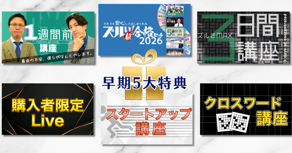【2026最新】合格に必要なすべてが手に入る『ズルい!超合格セット』★早期購入特典プレゼント★ 2025/12/05 登録販売者 資格取得 ━━━━━━━━━━━━━━━━━━━★1月購入者限定★購入者限定の5大特典がすべて受け取れます【勉強スタート〜試験直前まで安心の5大特典】●スタートアップ講座●クロスワード講座 ●3日間講座 ●1週間前講座 ●購入者限定Live すべて受け取れるのは1/31まで※2026リトライクーポンの対象者様にはメールにてご案内をお送りしています。メールをご確認ください。━━━━━━━━━━━━━━━━━━━詳しくは下部をチェック 👇購入はこちらから ズルい!超合格セットは「教育訓練給付制度」の対象です教育訓練給付金制度の条件を満たす方は受講料の20%支給を受けられます 登販試験合格を目指したい…でも覚えることが多くて大変そう、挫折しそう…と思っても超合格セットがすべてをサポートします! 試験に出る内容~挫折ポイントまでトータルサポートするから多くの方に選ばれています!ズルeラーニング受講生は毎年圧倒的な成果を実現されています。★合格率91.4%★満足度98.4%※2024首都圏を受けたYTL講座受講者の結果そんな講座が2026年度も始動します。忙しくて勉強時間がとれない…勉強が苦手で自信がない…という方でも安心仕事も家事も両立しながら合格したいという方にぴったりです! 今だけ5つの特別講座をお付けしますお得なうちにはじめましょう! 👇購入はこちら ズルい!超合格セット内容 暗記~問題演習まで、必要なものが全部そろったオンライン動画講座①全章講座 1~5章 試験全範囲を丁寧にわかりやすく解説!講義&確認テスト②漢方講座 苦手No.1『漢方処方製剤』が根本からわかるようになる解説③5章別表講座 3章・5章に出てくる暗記地獄のカタカナ成分をつなげて理解する解説④過去問題(5年分) いつでもどこでもWebで問題演習!全国5年分の過去問&解説⑤ブロック別出題予想 模試(お好きな1ブロック) 地域ごとに異なる試験問題・難易度に対応した、何度でも解ける模擬試験120問⑥ブロック別出題予想 講習会(お好きな1ブロック) 地域ごとに異なる試験問題・難易度に対応した120ポイント解説 【早期購入者特典】1月ご購入者はすべての講座特典が受け取れます①スタートアップ講座(約1時間)試験に合格するための勉強法を伝授する講座。勉強を始める前にご視聴ください。②1週間前講座(約2時間)試験1週間前からの点数底上げ。試験30点分をさらう毎年大人気の講座!③3日間講座(約12時間)たった12時間で試験重要ポイント全範囲を復習する講座。効率的に重要ポイントを理解できます。④クロスワード講座(約1時間)覚えづらい範囲をクイズのように楽しく学べる講座。苦手を得意に変えよう!⑤購入者限定ライブ+アーカイブ配布(5/26 19:00~)購入者限定の質問ライブ。気になることはすべて解決して下さい。 価格(税込) 一括購入特別価格 39,600円(それぞれ単品購入の場合 75,600円) ━━━━━━━━━━━━━━━━━━━★1月購入者限定★購入者限定の5大特典がすべて受け取れます●スタートアップ講座●クロスワード講座 ●3日間講座 ●1週間前講座 ●購入者限定Live ※2026リトライクーポンの対象者様にはメールにてご案内をお送りしています。メールをご確認ください。━━━━━━━━━━━━━━━━━━━早期購入者特典がすべて手に入る1月がおすすめです!2026合格を一緒に目指しましょう! 👇購入はこちらから 講座販売期間 2025年11月25日~2026年11月30日 受講期間(講座を視聴できる期間) 2025年12月24日~2026年12月13日※一部講座は開講期間が異なります。詳細はズルeラーニングのインフォメーションをご確認ください。※上記期間外は視聴できません 2026 登録販売者試験を目指す皆さん。ニガテも暗記も、もう困りたくない!今年こそ合格したい!そんな方は、圧倒的合格率で、しかもオモシロイ、ズルい!超合格セットで始めましょう! 前のお知らせ 一覧に戻る 次のお知らせ